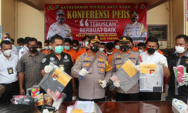 Batu Bara, Impresinews.com – Kapolres Batu Bara, AKBP Ikhwan Lubis SH MH, didampingi Kasat Reskrim, AKP Ferry Kusnadi, SH, MH, dan Kapolsek Lima Puluh, beserta Jajaran Kanit Reskrim Polsek Lima Puluh, Labuhan Ruku, dan Indrapura, saat menggelar jumpa Pers, Rabu (22/9/2021), menceritakan uraian kejadian.