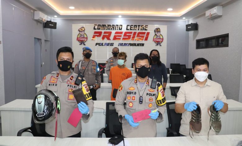 Lanjut, Kapolres, terduga pelaku tertangkap di wilayah Kecamatan Jasingan Kabupaten Bogor yang dicurigai oleh warga sekitar dengan ciri ciri yang sesuai dengan apa yang diberitahukan oleh Satuan Reskrim Polres Sukabumi, yang kemudian terduga pelaku diamankan oleh personel Polsek Jasinga