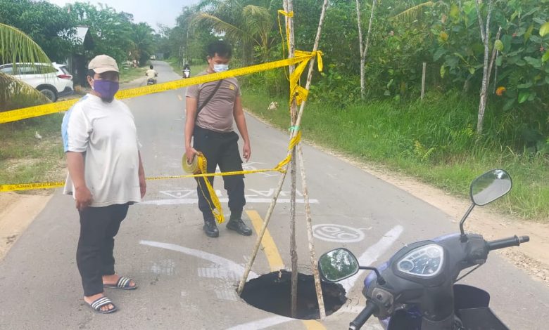 Ada Lubang Menganga di Jalan Raya Kecamatan Seluas, Kapolsek Seluas Pasang Tanda Police Line