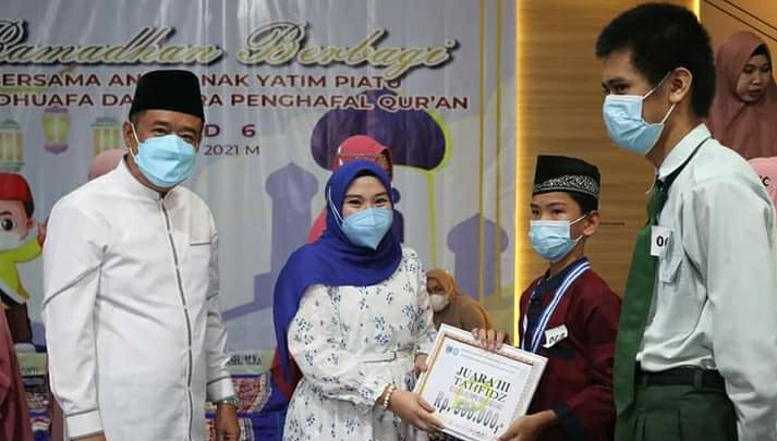 impresinews.com (Lahat)- Bupati Lahat, Cik Ujang,SH, didampingi Ketua TP PKK Lidyawati Cik Ujang serahkan hadiah berupa logam mas kepada anak yatim, di Pendopoaan Rumah Dinas Bupati Lahat Minggu (2/5/2021)