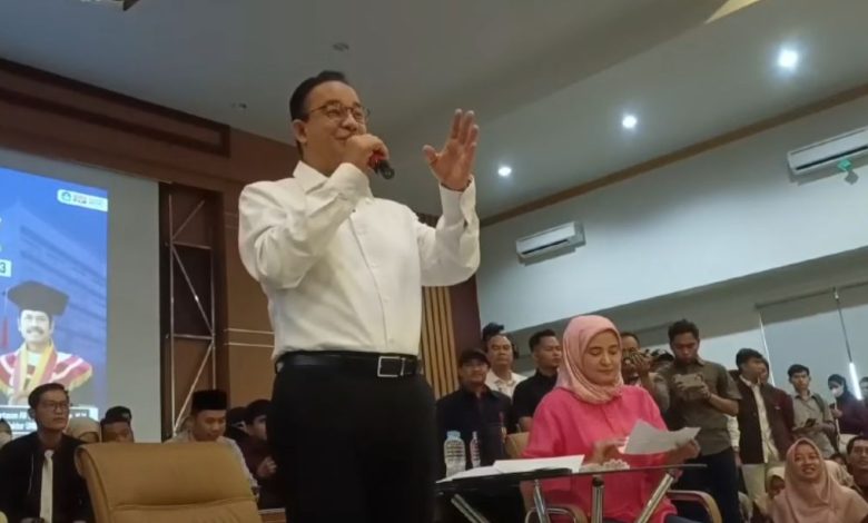 KOTA SERANG,- Calon presiden (Capres) nomor urut 1, Anies Baswedan menghadiri dialog publik di Universitas Bina Bangsa, Kota Serang, Banten, Kamis (21/12).