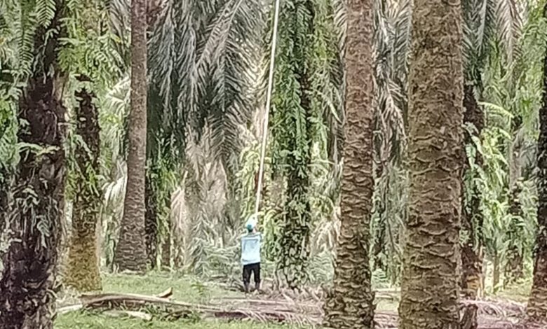 Meski telah diingatkan akan pentingnya Alat Pelindung Diri (APD) ketika melakukan aktivitas panen buah sawit, ia tetap tak bergeming.