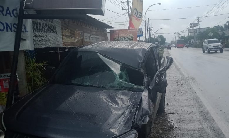 Terlihat bagian depan mobil ringsek dan masih terparkir di lokasi kios, persisnya di Jalinsum depan SDN Negeri No.115525, Sigambal, Kecamatan Rantau Selatan.