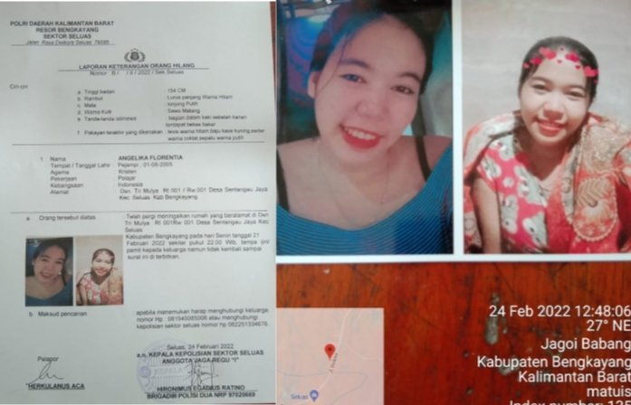 Bengkayang _Kalbar,- Seorang anak perempuan yang masih duduk di bangku Sekolah Menengah Atas (SMA) bernama Angelina Florentia(17), warga dusun Tri Mulia, desa Setangau Jaya, kecamatan Seluas, kabupaten Bengkayang. Diketahui telah hilang, sejak Senin (21/2/2022) sekitar pukul 22.00 WIB.