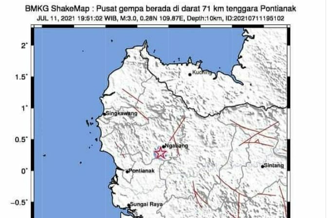 Pontianak_Kalbar,impresinews.com,- Wilayah Kecamatan Jelimpo, Kabupaten Landak Provinsi Kalimantan Barat diguncang gempabumi tektonik, dari hasil analisis BMKG gempa tersebut berkekuatan M= 3.0 dengan Episenter gempabumi terletak 0.28 LU dan 109.87 BT, atau tepatnya berlokasi di darat pada jarak 71.4 km tenggara Pontianak, Propinsi Kalimantan Barat pada kedalaman 10 km. Minggu (11/7/2021) Pukul 19 :57.Wib.
