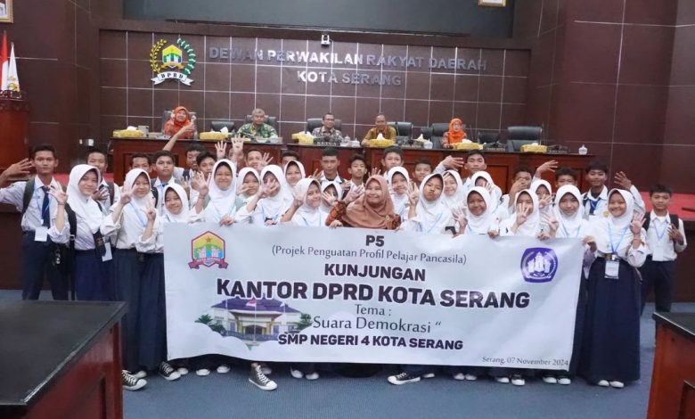 KOTA SERANG,- Dewan Perwakilan Rakyat Daerah (DPRD) Kota Serang menerima kunjungan dari siswa siswi dan para guru SMP Negeri 4 Kota Serang. Tujuan tersebut dalam rangka memperdalam pemahaman suara demokrasi dalam rangka Projek Penguatan Profil Pelajar Pancasila, (P5).