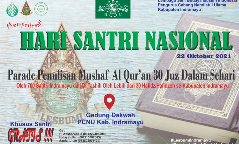 Indramayu, Impresinews.com – Peringatan Hari Santri Nasional (HSN) tahun 2021, Pimpinan Cabang (PC) Lembaga Seni Budaya Muslim Indonesia (Lesbumi) Kabupaten Indramayu, Jawa Barat akan menggelar parade mushaf Al Qur’an tercepat, 30 juz dalam sehari.