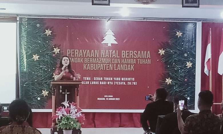 Landak_Kalbar,- Seketaris DPD PDI Perjuangan Karolin Margaret Natasa dan Angeline Framelco Anggota DPRD Provinsi Kalimantan Barat menghadiri Natal bersama, Landak Bermazmur dan Hamba Tuhan yang berada di Kabupaten Landak, Rabu 18 Januari 2023.