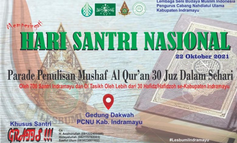 Indramayu, Impresinews.com – Peringatan Hari Santri Nasional (HSN) pada tanggal 22 Oktober ini, bakal dimeriahkan dengan parade Mushaf Al Qur’an 30 Juz dalam sehari. Parade Mushaf Al Qur’an tersingkat ini diharapkan dapat mencetak rekor.
