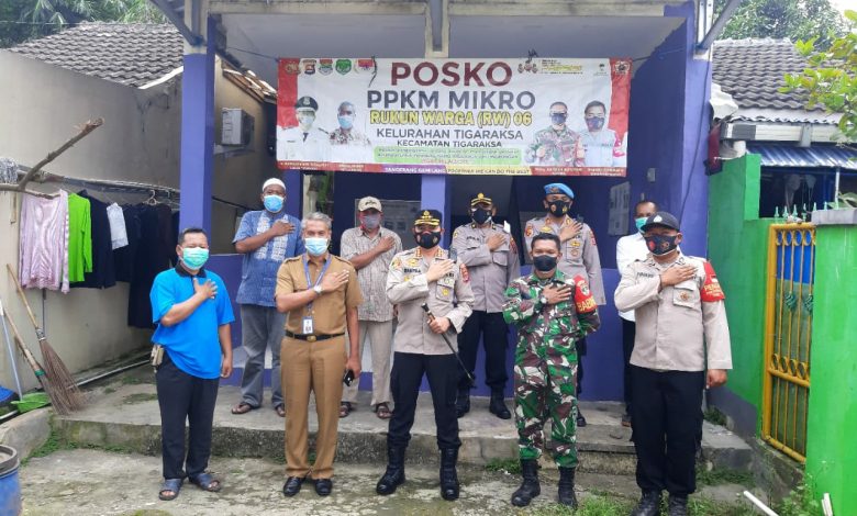 Tangerang, impresinews.com,– Guna menekan penyebaran virus COVID-19, Kapolresta Tangerang Kombes Pol Wahyu Sri Bintoro melaksanakan pengecekan ke Posko PPKM darurat RW 06 Perum Sudirman Indah Kelurahan Tigaraksa, Kecamatan Tigaraksa, Kabupaten Tangerang, Banten, Senin (5/07/2021).