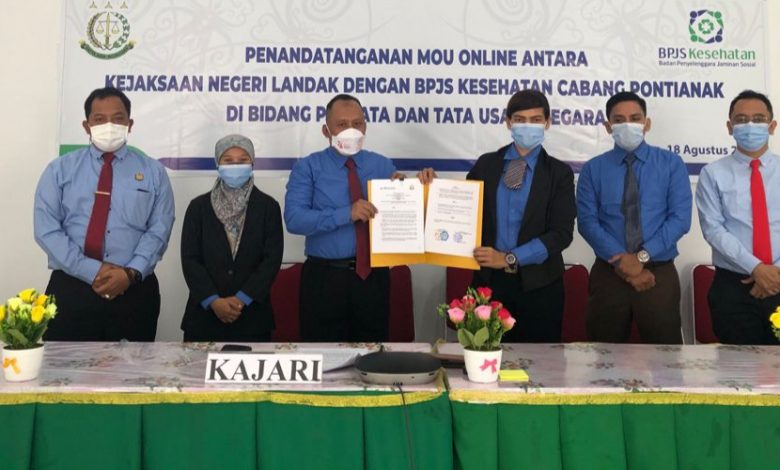 Landak_Kalbar, impresinews.com,-Kepala Kejaksaan Negeri Landak Sukamto melakukan penandatanganan MOU online dengan Badan Penyelenggara Jaminan Sosial (BPJS) Kesehatan cabang Pontianak, dalam bidang Perdata dan tata Usaha Negara. Rabu (18/8/2021).
