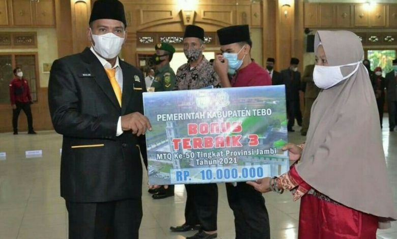 Bonus kepada peserta kafilah Tebo yang berprestasi pada MTQ ke-50 Tingkat Provinsi Jambi Tahun 2021 yang lalu.
