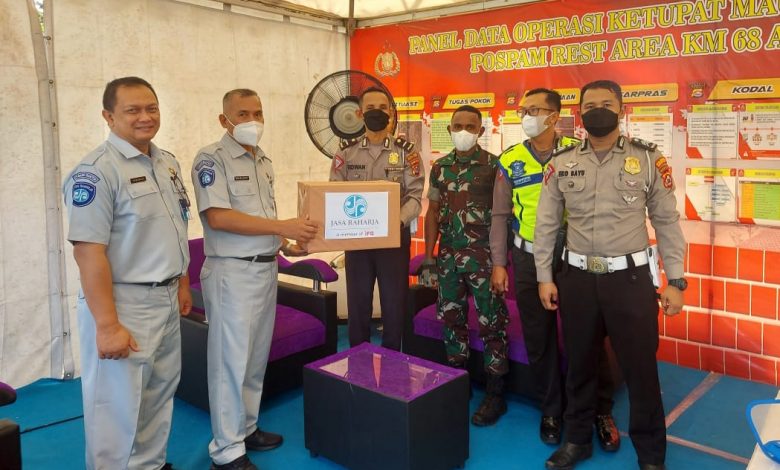 Penyerahan bingkisan dan APD juga di berikan di Pos pelayanan di rest area KM 68 A tol Jakarta – Merak yang di terima oleh Ipda Ridwan Junaedi, “ini adalah wujud kepeduliam Polri dan PT Jasa Raharja untuk melayani pemudik yang ingin ber istirahat di rest area KM 68 A, semoga kami dapat melayani pemudik dengan baik dan kami juga berharap pemudik selamat sampai tujuan”.