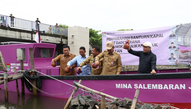 Pj Bupati Tangerang Serahkan Bantuan Kapal dan Sarana Alat Tangkap Ikan