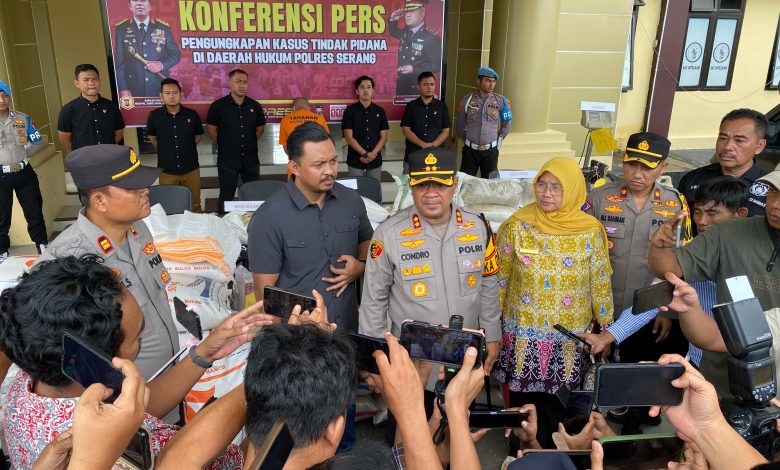 Kapolres menjelaskan terbongkarnya dugaan tindak pidana persaingan curang dan perlindungan konsumen dengan modus mengoplos dan repacking beras, setelah Tim Unit Tipidter dan Polsek Carenang melakukan penyelidikan terhadap huller yang juga gudang penyimpanan beras.