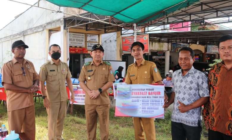 LANDAK – Pj. Bupati Landak Samuel, SE, M.Si menyerahkan secara simbolis bantuan perahu evakuasi banjir, sumber dana Desa Hilir Tengah kepada 4 dusun di wilayah Desa Hilir Tengah, Kecamatan Ngabang, di Kantor Desa Hilir Tengah. Selasa (10/01/2023).