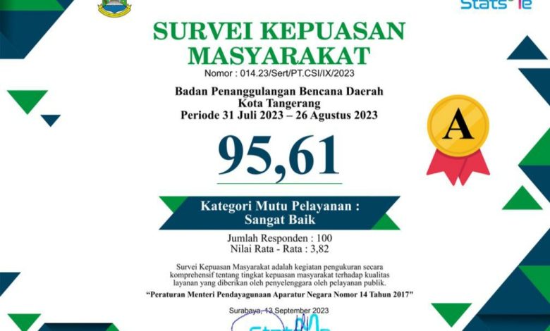 Ia pun mengungkapkan ini merupakan pertama kalinya BPBD Kota Tangerang meraih Kepuasan masyarakat sangat baik, yang diberikan oleh survey independen Statsme. Tentunya ini menjadi semangat baru untuk terus memberikan pelayanan yang terbaik kepada masyarakat Kota Tangerang.
