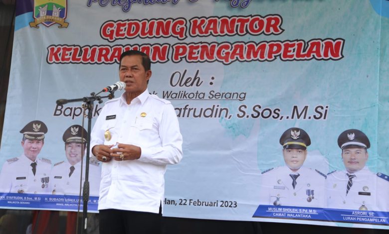 SERANG,- Gencarkan pembangunan demi meningkatkan pelayanan bagi masyarakat, Walikota Serang Syafrudin berkesempatan meresmikan secara langsung kantor kelurahan pengampelan, Kecamatan Walantaka, Kota Serang, Rabu (22/02).
