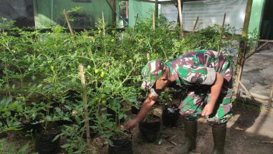 PANDEGLANG,-Koramil 0111/Pagelaran, Kodim 0601/Pandeglang dalam mendukung program ketahanan pangan memanfaatkan lahan kosong untuk ditanami tanaman produktif dengan media tanam polibag,…
